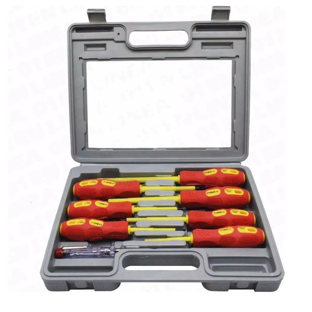 Incluye 8 piezas: Planos. 0.5×3.0x75mm 0.8×4.0x100mm 1.0×5.5x125mm 1.2×6.5x150mm PH0x3.0x75mm PH1x4.5x75mm PH2x6.0x100mm UNIDAD DE BUSCAPOLO AC100-250V