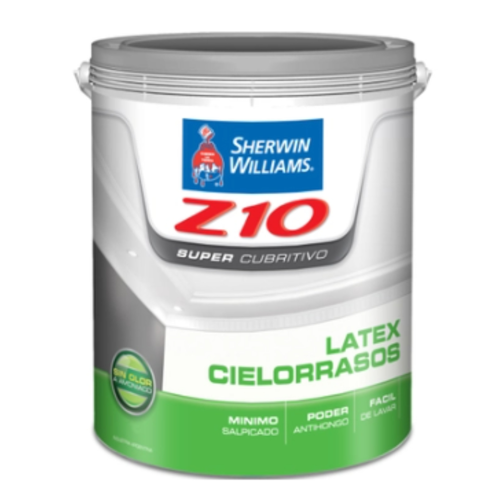 Z10 SUPER CUBRITIVO CIELORRASOS MATE Es una pintura al látex de muy buena calidad especialmente formulada para lograr un acabado muy blanco con muy buena adherencia y resistencia a los hongos. Su alta porosidad evita los problemas de condensación típicos de superficies selladas.